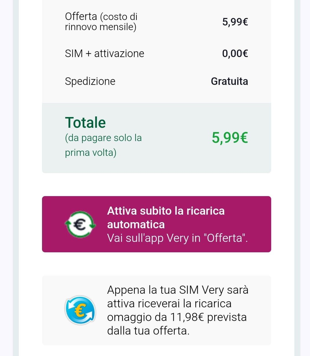 faland1266 Premetto che probabilmente il tema è stato già discusso, ma visto che il 3d è piuttosto lungo non ho avuto riscontro da un primo sguardo. La Domanda è la seguente... Mi è stata recapitata oggi la Sim a distanza di 9 giorni dall'ordine. Il problema è che da stanotte ore 24 mi si rinnova l'offerta col vecchio operatore, quindi se attivo la sim la portabilità avverrà entro la fine di questa settimana max primi giorni della prossima ovvero perderei il mese appena rinnovato col vecchio operatore. Posso aspettare inizio anno per effettuare l'attivazione della sim Very e concludere il relativo processo di portabilità in modo da poter usufruire del mese in essere col vecchio operatore? Ho provato a contattare il servizio clienti Very al numero 1929 ma mi hanno tenuto in attesa a tempo indefinito evidenza del fatto che l'offerta ha avuto un "discreto successo". Grazie, a chi saprà fornire info utili sul caso. 👍