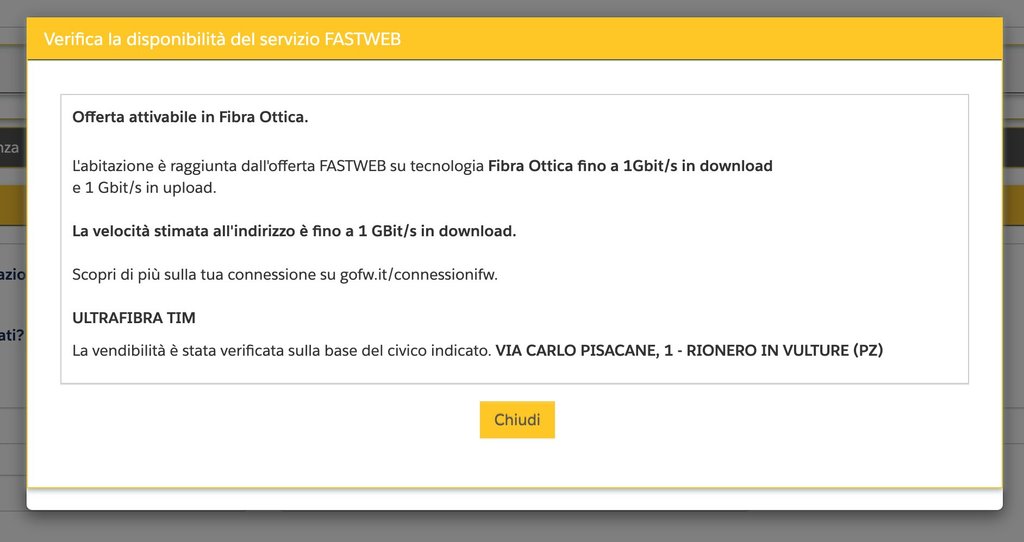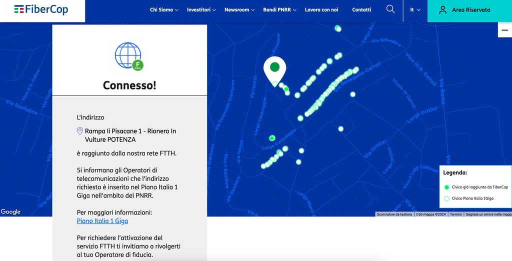ora come anche ha verificato il buon Walt, risulta che l'attestazione della chiostrina, da quello che si è capito è senza pte. ma, vedendo il sito fibercop, risulterebbe censito tramite Piano Italia 1 Giga.