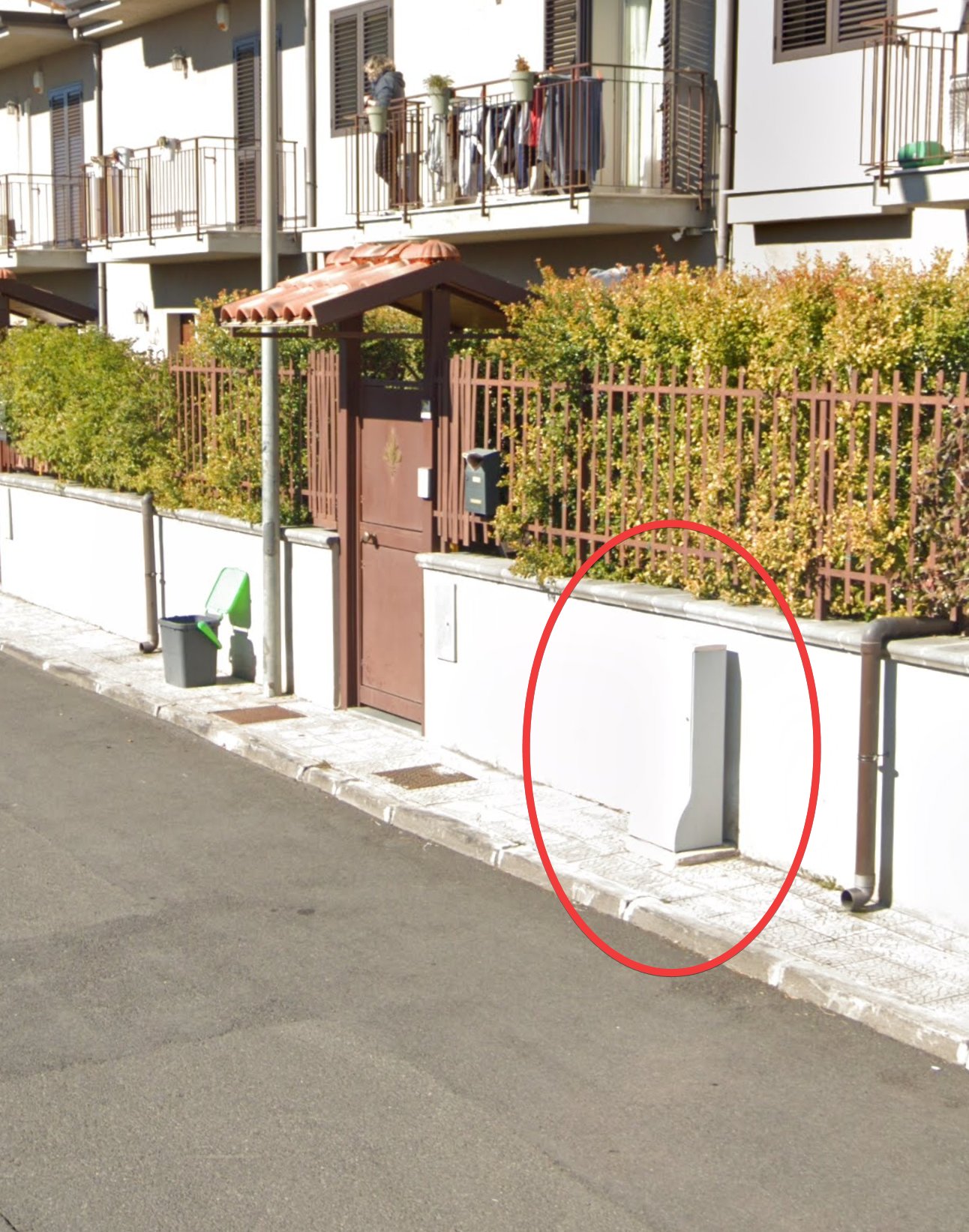 walt VooDoo2U Il distributore rame è l'armadietto su strada? Beh può essere posizionato in vari luoghi...sicuramente sulla tua strada ce n'è almeno uno a marciapiede cioè quello cui mi riferivo io, vedi foto Però... VooDoo2U Il doppino che arriva nel mio appartamento è smistato da un armadietto a parete interno al mio palazzo ...questa evidenza è sospettosa...per caso quell' "armadietto" è dotato di etichetta/targhetta con qualche codice? Il tuo civico in banca dati è geolocalizzato qui https://www.google.com/maps/place/37%C2%B034'01.3%22N+15%C2%B001'12.3%22E/ ma mi è poco chiara l'effettiva dislocazione dei barrati.