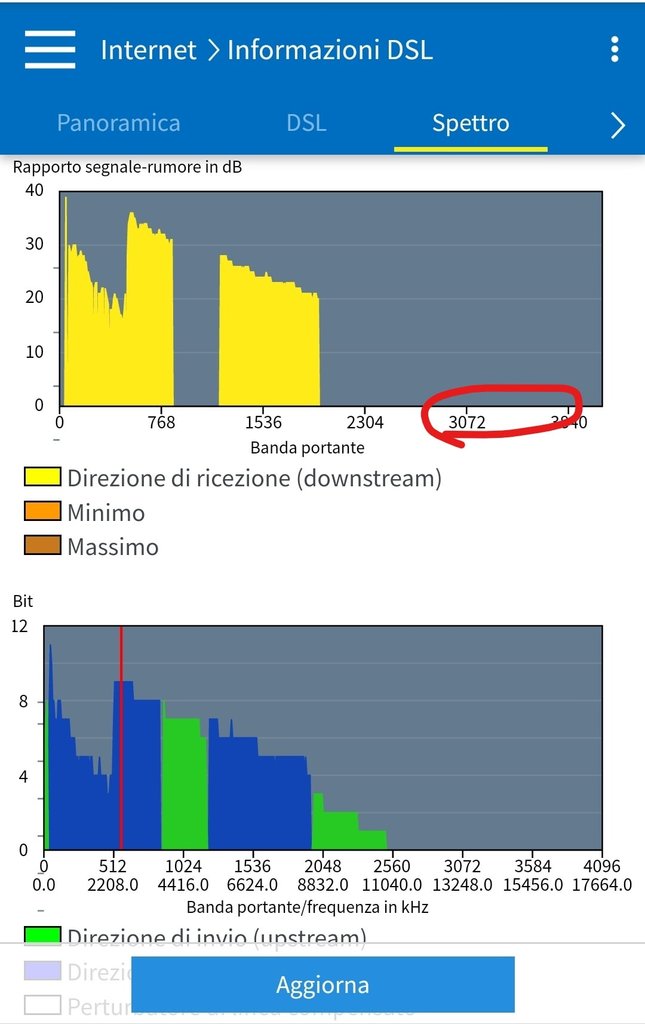 Unica cosa anomala è che ieri monitorando la linea durante un paio di connessioni vedevo "apparire" sporadicamente sul grafico dello spettro alcune linee dove ho cerchiato