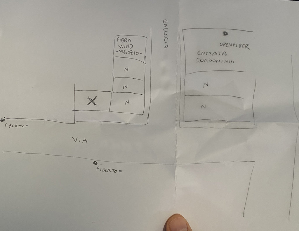 Il tecnico fastweb mi ha detto che ho due centraline Fibertop davvero vicinissime, ma che per attaccarmi devo chiedere permessi in giro poichè (come si vede dall'immagine) la centralina più vicina dal mio lato è sul condominio a fianco.