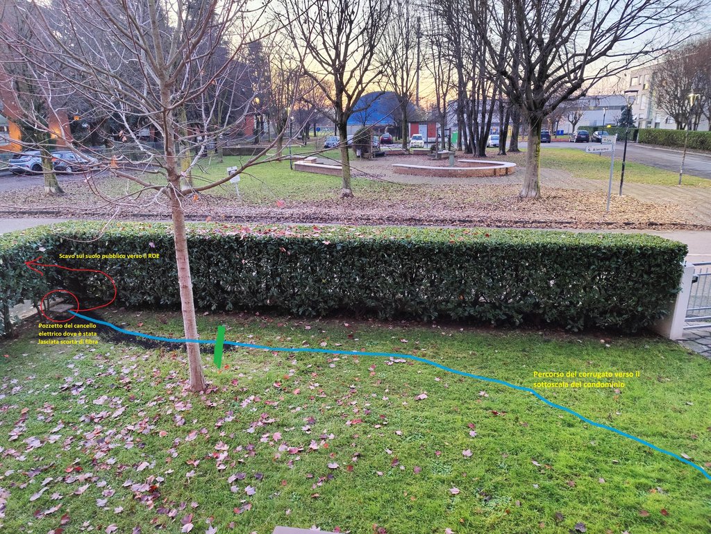 Ho solo un dubbio, per portare il PTE nel condominio è stato utilizzato un vecchio corrugato vuoto che dal pozzetto del cancello elettrico, arriva nel sottoscala del condominio; purtroppo questo corrugato, benchè sano, non credo sia a norma per un corrugato da esterno, e per circa un paio di metri scorre sottoterra ma a non più di 25-30 cm di profondità, io volevo quindi farci una gettata di cemento per prevenire eventuali rotture ma l'amministratore del condominio si è opposto, ho quindi scavato fino al punto dove c'è la linea verde ed ho interrato di più il corrugato, oltre ad averlo interrato un pò di più ho fatto un letto ed una copertura bella spessa di sabbia fine per poi ricoprirlo di terra, in questo modo spero di avere creato una specie di "cuscino" per proteggere il corrugato; dalla linea verde in poi il corrugato scorre molto più in profondità nel terreno e non credo ci siano più problemi.