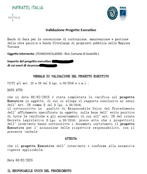 ps. Riguardo la domanda sulla convenzione.. sui documenti del comune c'è solo la delibera del consiglio che approva. Sindaco e assessore, contattati, non ne sanno rispondono vagamente e alludendo sempre a problemi lato Infratel inerenti la progettazione (?).