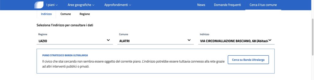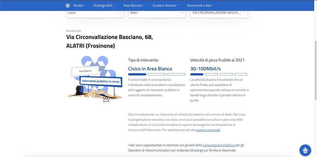 volevo chiedere la vostra sulla mia situazione: davanti casa mia sono stati fatti degli scavi per la realizzazione dell'infrastruttura di rete in FTTH del "Bando Italia1Giga" di Infratel, come indica anche l'ordinanza del comune. L'istituzione del senso unico alternato dovrebbe terminare il 31 dicembre, e suppongo anche i lavori. Ora, ci sono delle cose strane, come ad esempio il sito di bandaultralarga.italia.it che dà il mio civico come in area bianca, oggetto di intervento pubblico in corso di completamento, ma i civici vicino al mio (es. 66, 70) li segnala come area grigia/nera. Inoltre, il mio civico compare soltanto nel sito di bandaultralarga.italia.it, e non sul sito connetti.italia.it, come se non fosse oggetto del piano. A questo punto chiedo, secondo la vostra esperienza, con che tipo di fibra sarò coperto e in che tempi me la attiveranno e cominceranno a uscire offerte di operatori.