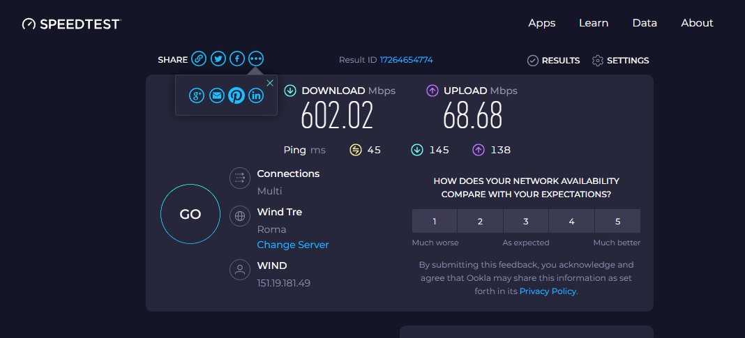 Donghler Finalmente la CPE è arriva e dopo un bel pò sono riuscito a farla partire. Ho avuto molte difficoltà perchè non riuscivo a capire come settare (non sono per nulla esperto in materia) Questo è uno speed test fatto dal terrazzo, appena possibile installo sul tetto sul palo dell'antenna tv (spero non dia fastidio a livello di interferenze) speed test con very mobile ho l'antenna a 150 mt in linea d'aria