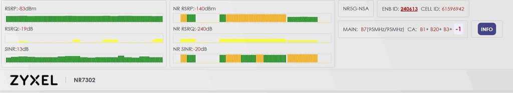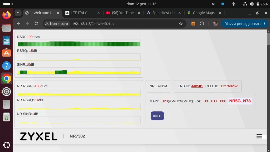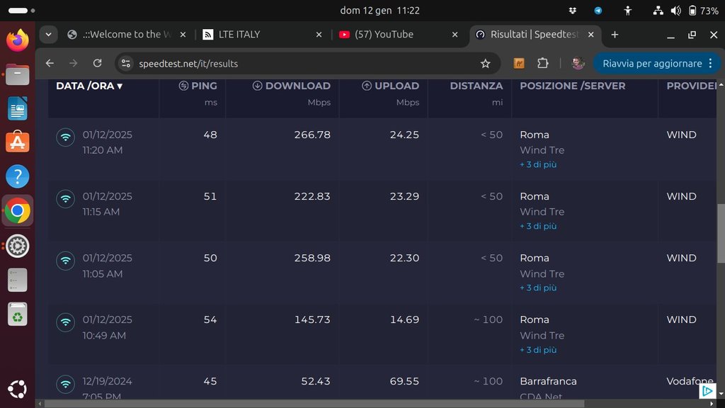 Allora, quest'oggi ho fatto un paio di test con maggior visibilità dell'antenna, e ho avuto la possibilità di fare una comparazione con un Zyxel FWA710 che mi hanno prestato (spero di poter fare ancora un paio di test). Purtroppo non sono ancora in condizioni di fare una prova dal tetto (mi devono ancora montare la linea vita acciderbola).