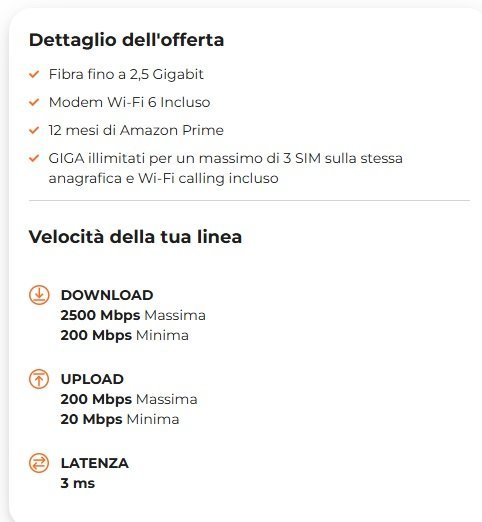 Sono da poco con fibra tim (ero gia tim con FTTC), ho attivato una linea nuova per poter usufruire di scontistiche, visto la copertura da un mese a questa parte sono stato raggiunto da fibra full ottica, Mi avevano assicurato che la linea sarebbe stata a 2,5gb ed in effetti se vado sul sito mi dice: