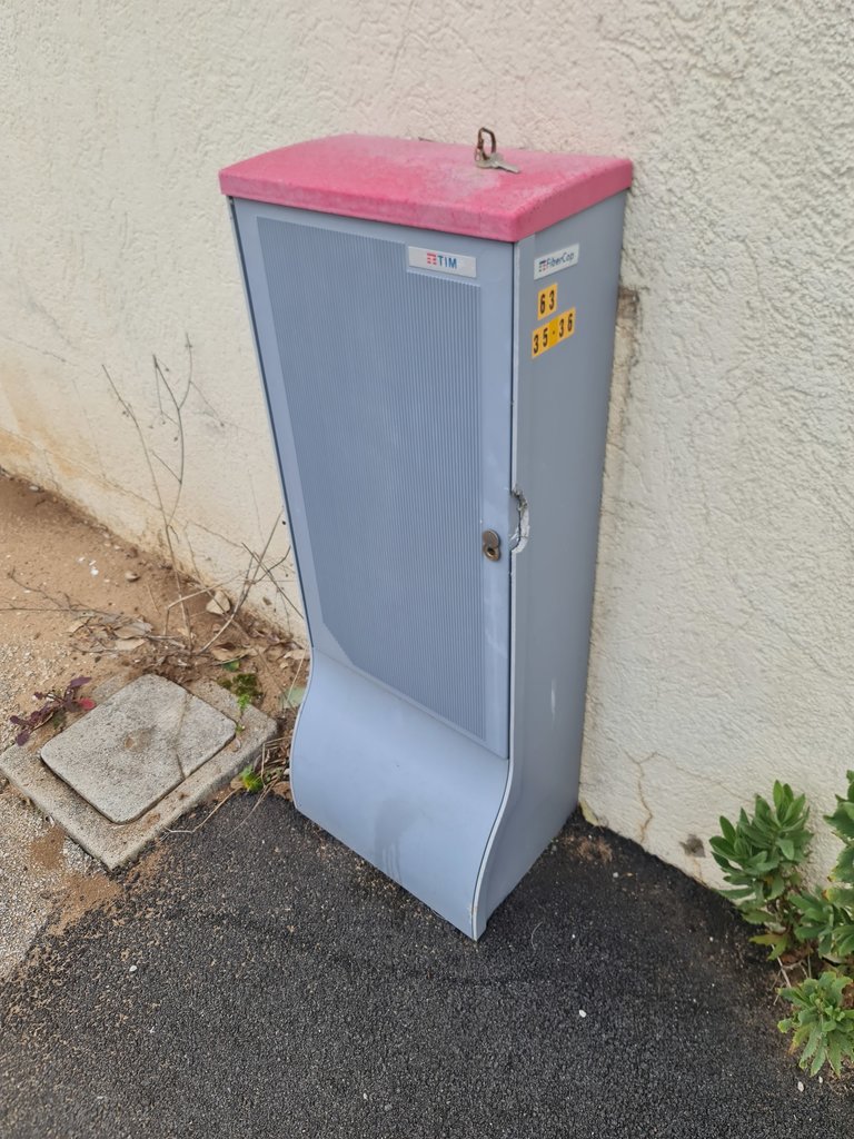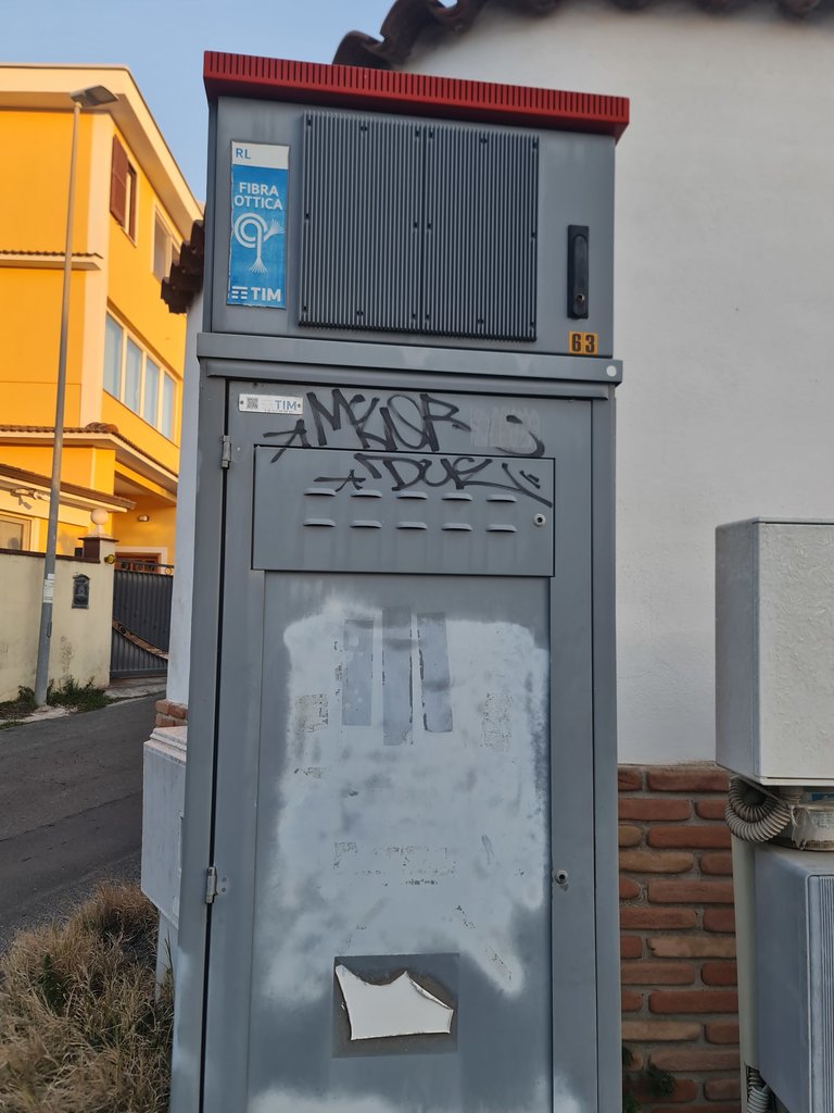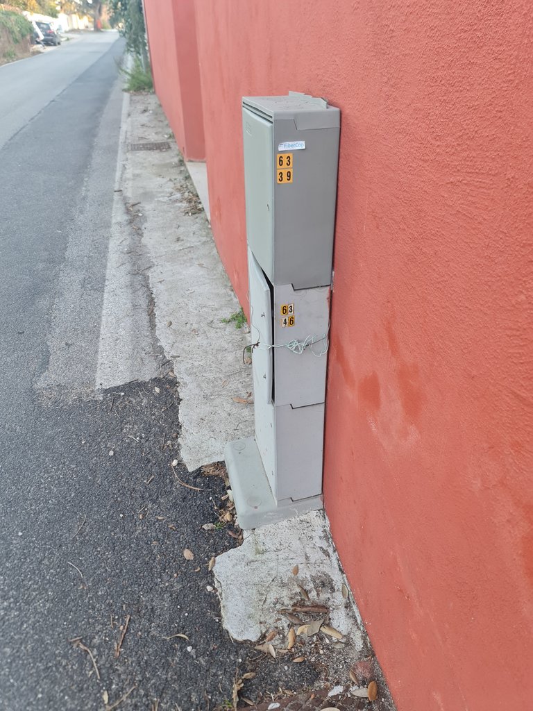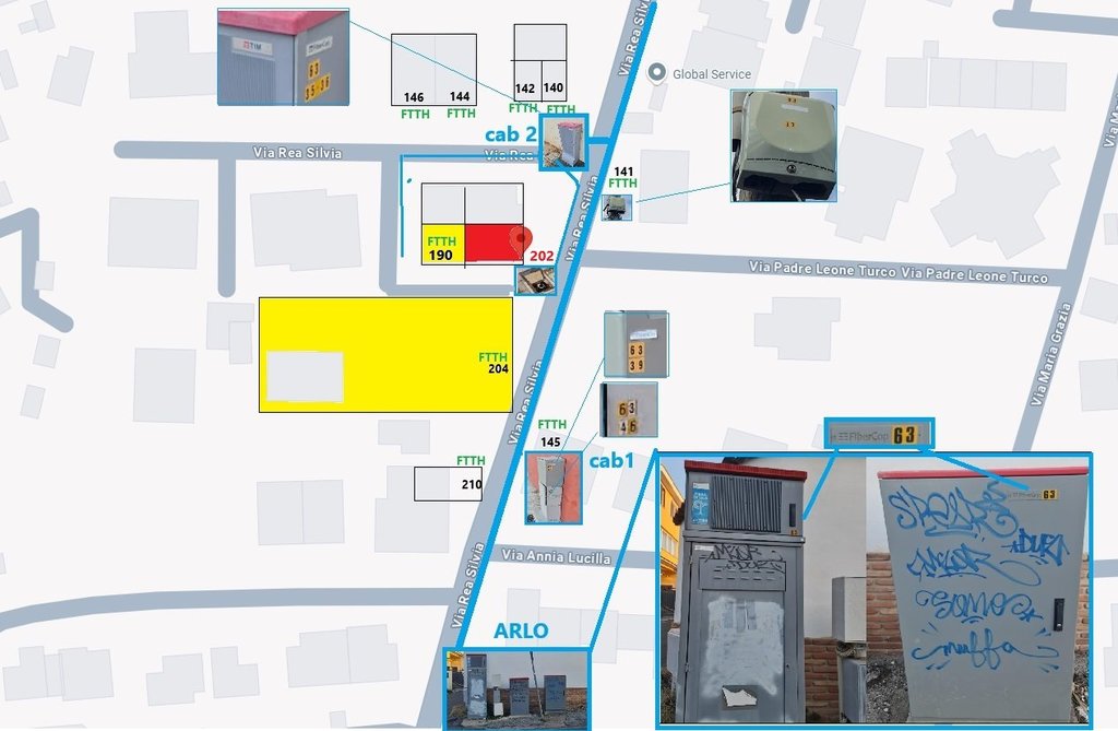 Allego mappa della strada, dalla quale si evince che praticamente sono circondato da case con FTTH 😀. La mia casa al numero 202 (in rosso sulla mappa), è parte di una quadrifamiliare. La parete adiacente al mio salone, è del vicino n°190 che ha FFTH. I vicini che si trovano sul mio stesso marciapiede ma lato destro cancello (n.204) e lato sinistro (n. 142 e 140) come anche i vicini sul marciapiede opposto, ma stessa strada, numeri 141 e 145 hanno tutti FTTH. Praticamente, su tutti i lati, i miei vicini hanno FTTH. Mi sembra un segnale promettente. All'inizio della strada via Rea Silvia ci sono le 3 cabine Tim/Fibercop con etichetta 63 di cui una suppongo sia l'Arlo (allego foto). Da questa hanno passato interrandoli i cavi fibra (linee blue sul disegno) incontrando, da traccia, una prima cabina (che indico "Cab1") che ha numeri 63: 39 e 63:46 al numero civico 145 che risulta FTTH. La traccia scavo prosegue alla "Cab2" (numeri sulla cabina 63: 35-36) che si trova al numero civico 140 ed anche qui è FTTH.