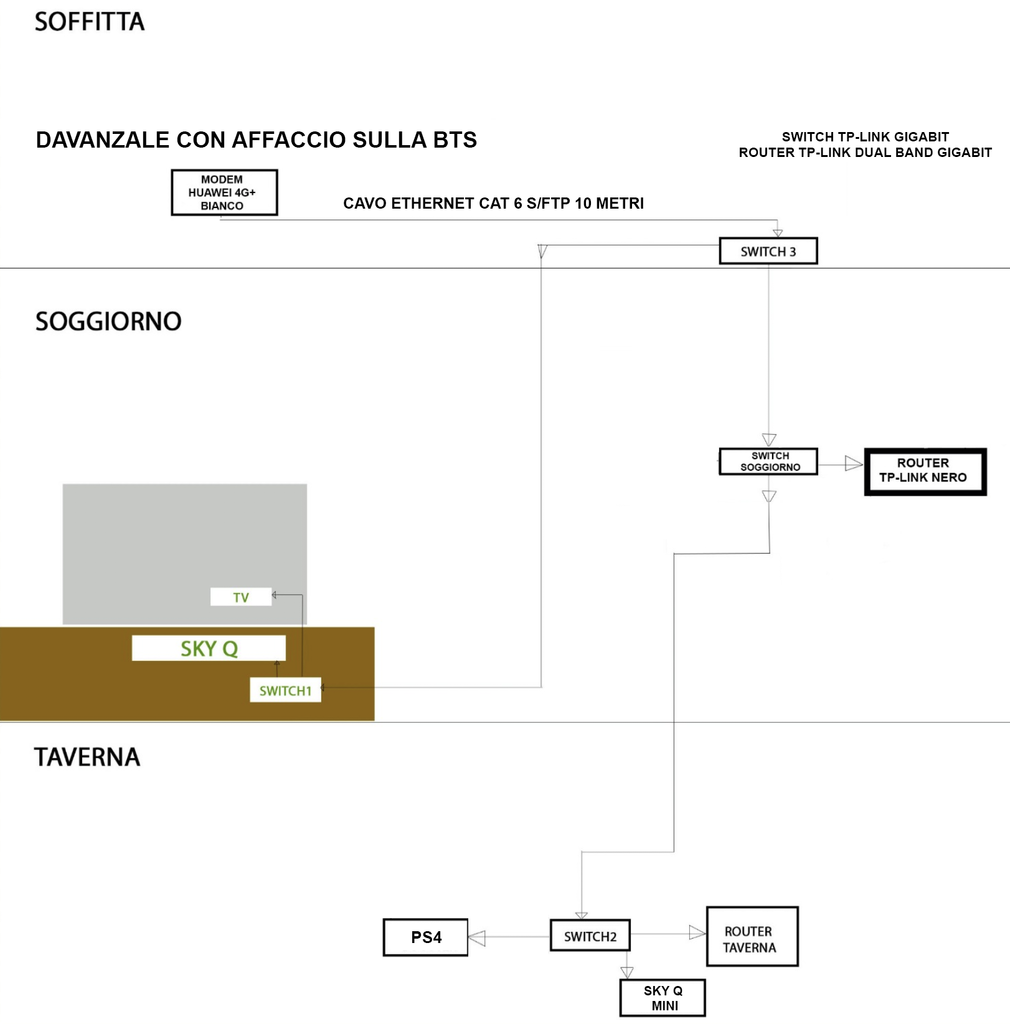Nel seminterrato c'è un terzo ed ultimo switch che dirama il segnale ad un router e ad altre periferiche cablate (smart tv, playstation, sky).