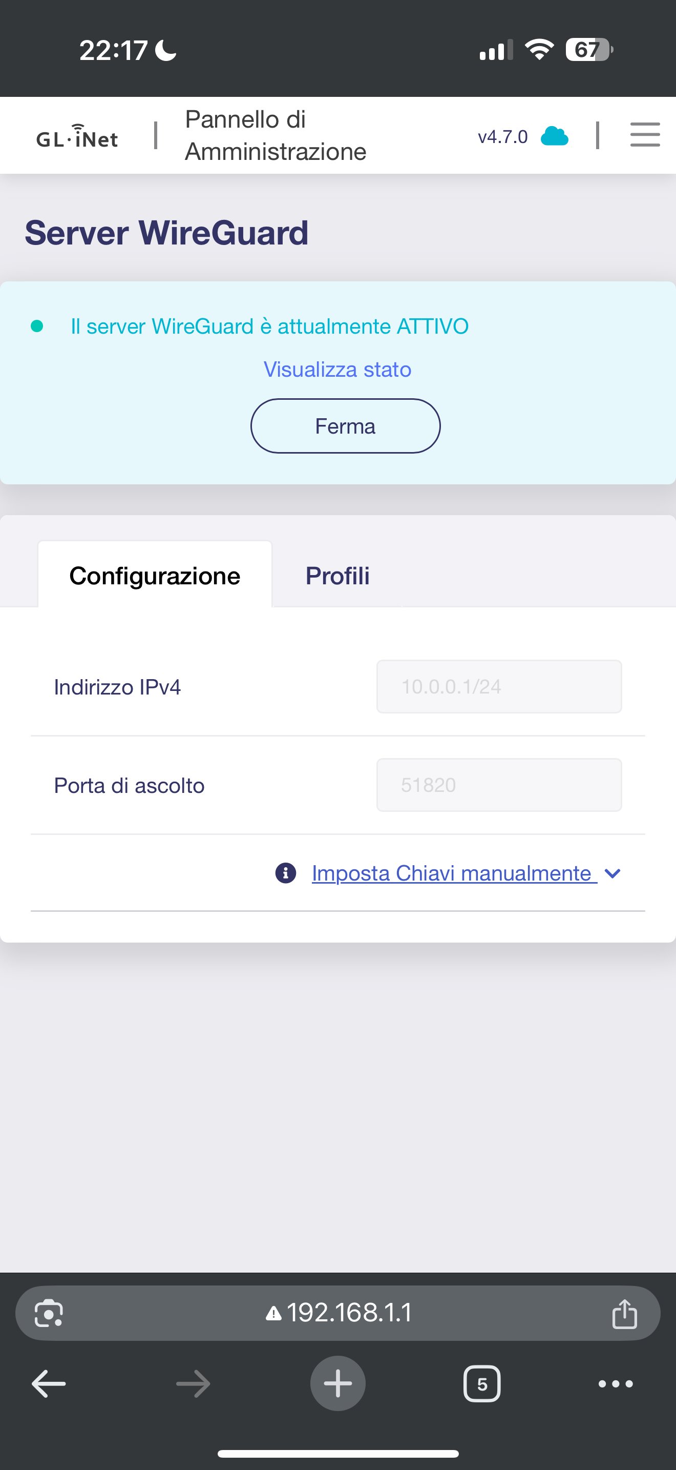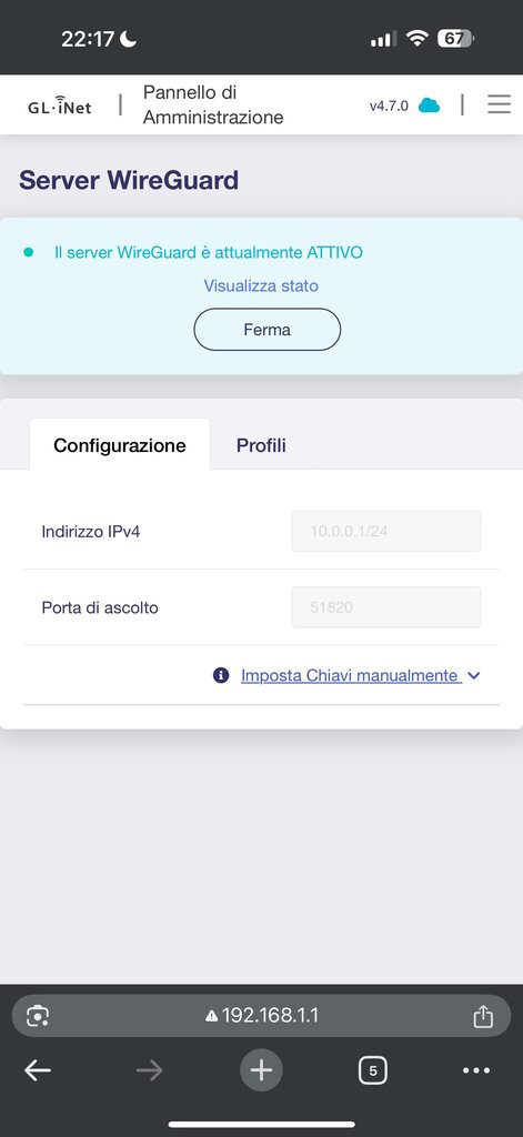 Ho già configurato il server wireguard e ho attualmente come client il mio telefonino (S22 ultra) tramite applicazione wireguard.