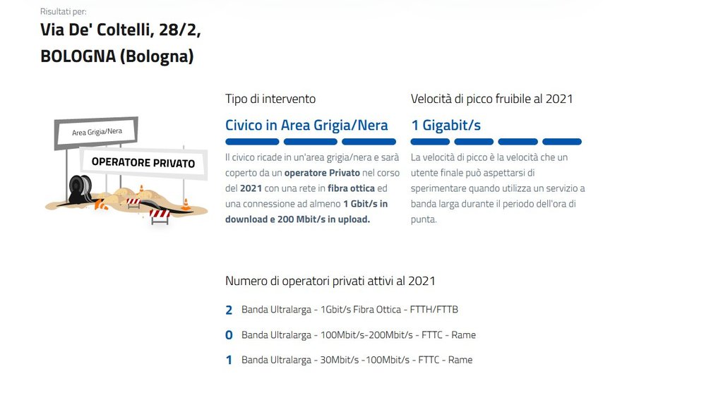 I condomini accanto possiedono FTTH, mentre il nostro non risulta coperto da nessun operatore e nemmeno dal sito di OpenFiber. Se si cerca la copertura su altri siti si trovani questi risultati (allego screenshot):
