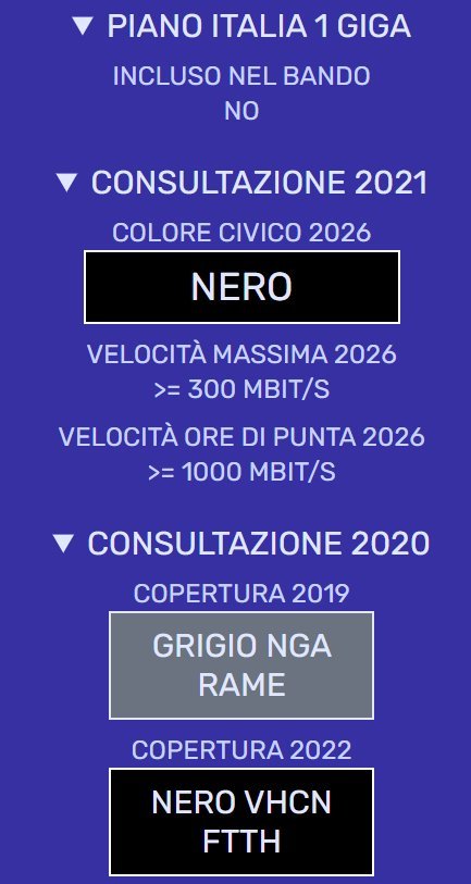 su mappaturaInfratel mi dice: non incluso nel bando Italia 1 giga, Colore civico 2026 NERO Velocità massima 2026 >= 300 Mbit/s, Velocità ore di punta 2026 >= 1000 Mbit/s