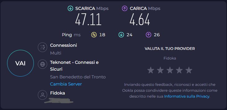 Parlando di prestazioni non posso che essere più che soddisfatto, come detto nel titolo ho un piano da 50 Mbps in download e 5 in upload, e da quando questa linea è attiva non ci sono mai stati problemi, n'è rallentamenti, neanche con le condizioni meteo più critiche, parliamo di neve, pioggia abbondante, vento forte e nebbia da non vederci neanche a 2 metri di distanza, e nonostante ciò non ha mai perso di prestazioni, sia in fattore ping, down/up e perdita di pacchetti, vi allego anche uno speedtest fatto poco fa con tempo non proprio dei migliori.