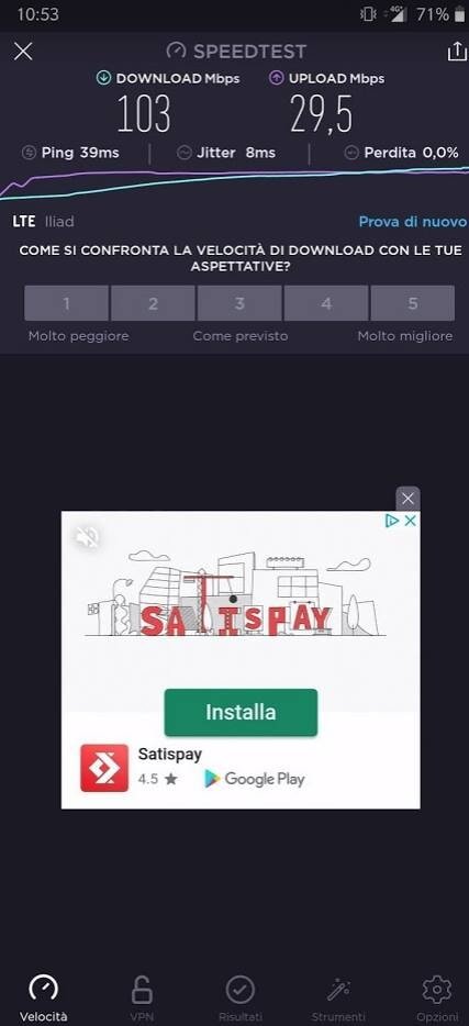 Ho fatto delle prove col mio cell con scheda iliad (si collega a bts wind3) e anche se in casa il segnale è quasi assente (abito in campagna), sul terrazzo al primo piano riesco a fare speedtest anche a più di 100 Mbit in download e anche intorno ai 50 Mbit in upload.