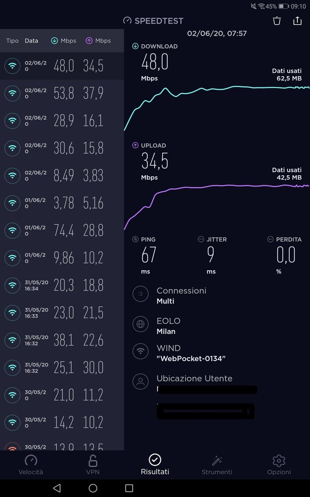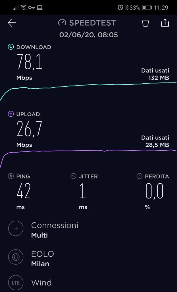 ho notato come la BTS sia sicuramente poco performante quando non è scarica (se vedete c'è un test fatto il 1/6 che arriva a 74mb, è stato fatto internamente a casa la mattina poco prima delle 8)
