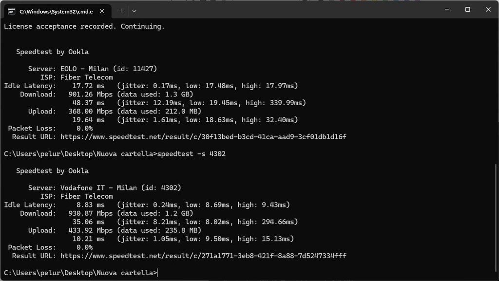 Le velocità (down e up) sono soddisfacenti, e il ping è molto basso rispetto a quanto avevo prima in FTTC, generalmente compreso tra 15-20 e difficilmente comunque sopra i 30 nei server europei.
