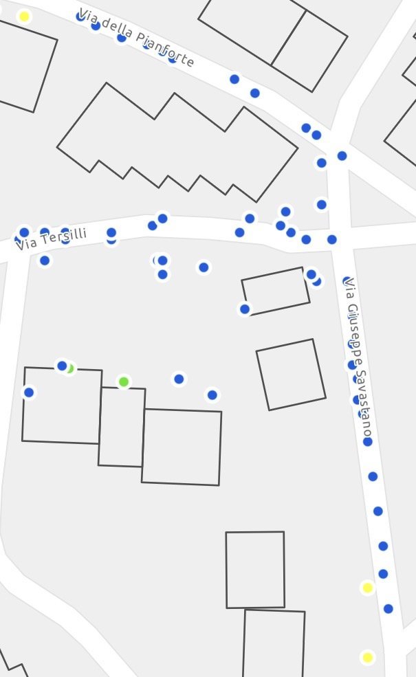 Qui ci sono oltre 60 pallini, di 3 colori diversi, ma in ciò che vedete non ci sono neanche 40 civici, quindi per forza di cose alcuni di quei pallini si riferiscono ad altre abitazioni, esempio la mia, che non sono lontani ma non hanno pallini