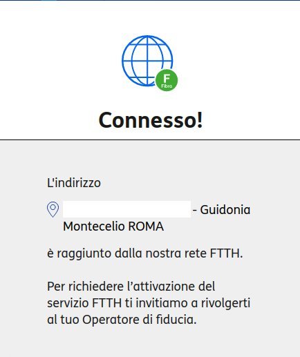 Non so se verrò raggiunto da OpenFiber (controllando sul sito dice che il mio indirizzo non è coperto), da FiberCop (sul loro sito il mio indirizzo risulta già connesso, ma a me sembra di no...) o da entrambi.