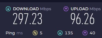 La valutazione è sicuramente positiva, non ho avuto alcun calo di prestazioni, oscillando tra 295/96 e 300/96 con velocità reale media di 35 MB/s in download con picchi di 37/38 MB/s a fronte dei 2,5 MB/s dell'fttc di prima.