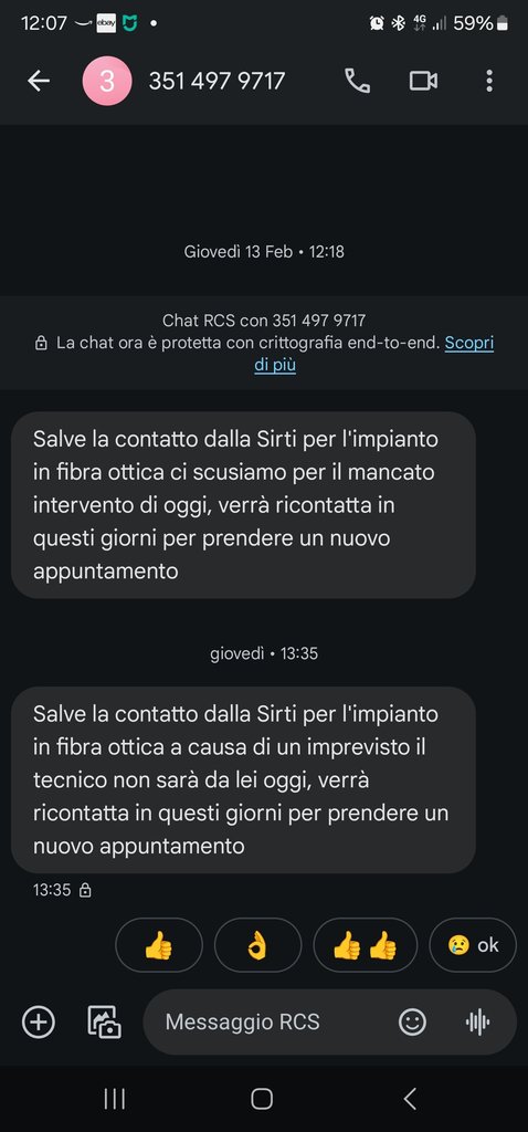 NicolaU Buongiorno, dopo aver predisposto scavo con tanto di canalina e sonda posata all'interno dalla finestra della strada privata alle scale e poi dalle scale al punto interno di casa mia dove vorrei mettere la borchia, Borchia che ho anche giá installato su scatola 503, dopo 2 NO SHOW di sirti, ora Iliad mi dice che lo stato è segnalato come: IN ATTESA DI REALIzzazione RFA ....qualcuno sa dirmi di piú in merito? grazie