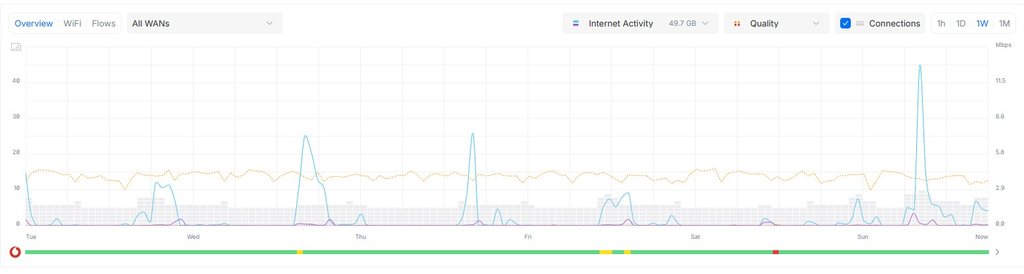 Sono riuscito a collegare la UDM-SE senza avere doppio Nat e non avere perdite di connessioni continue. Le uniche perdite succedono ogni tanto di notte quando l'ip viene ruotato, ma ho voluto aspettare (anche per questioni di tempo a disposizione) per vedere se la situazione fosse stabile. Allego la foto della connessione in una settimana