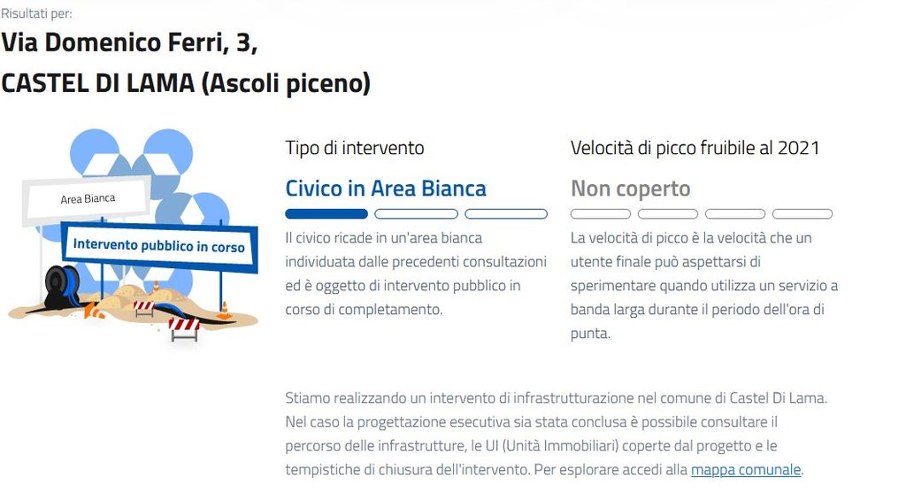 Casa mia (via Ferri, 3, Castel di Lama - AP- ) è una nuova costruzione del 2020 e ho aspettato da allora per muovermi: ora che ho scoperto che la fibra ha raggiunto già tutto il comune (infatti tutte le vie circostanti sono connesse). Ieri ho chiamato il costruttore che mi ha detto che a suo tempo hanno fatto predisposizione (il tombino è proprio di fronte casa mia) e avendo visto prima qualche post qui sul forum gli ho parlato di Rete Imprese ma non ne sapeva nulla. Sto aspettando che si informi al riguardo, ma nel frattempo chiedo aiuto anche a voi per capirci un po' di più.