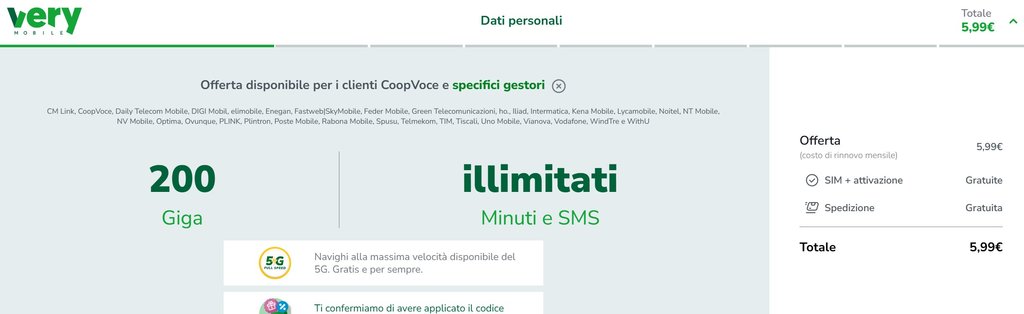 Fricc Raga se a qualcuno servisse ho 1 coupon per la winback 5.99 200gb full speed (https://verymobile.it/offerte/599-special-3) che in assenza della 4.99 rimane la migliore ad oggi in circolazione. Sebbene indichi come scadenza il 27/7 in realtá fa andare avanti tranquillamente con l'ordine quindi non penso ci siano problemi. Per l'interessato metto telegram in bio