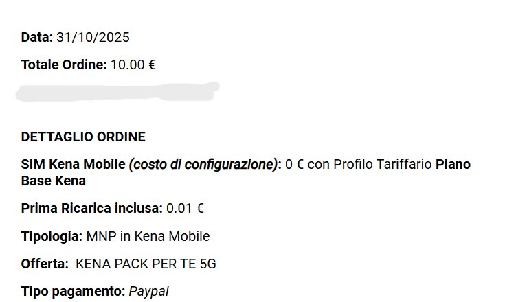 fabrizioo34 Ragazzi, non avete idea di cosa sono riuscito a combinare! 😂 Essendo stato un ex cliente Kena, avevo ricevuto il solito codice winback che rimandava alla solita offerta “Limited Edition” da 5,99. Ma ecco il colpo di genio: una volta arrivato sulla pagina dell’offerta, ho semplicemente modificato l’URL inserendo i nomi delle promo nascoste, la “Pack Per Te 5G” da 9,99 ogni 6 mesi o la 4,99 100GB 5G, e il sito le riconosce come winback! 🤯 Ordine completato senza problemi! Quindi basta ricevere il codice winback e dopo essere stati reindirizzati alla loro offerta, cambiare l'url in https://www.kenamobile.it/prodotto/kena-pack-per-te-5g/ o https://www.kenamobile.it/prodotto/499-100-gb-limited-ed-5g/ https://www.kenamobile.it/wp-content/uploads/KENA_Prosp_kenapackperte_30092025.pdf https://www.kenamobile.it/wp-content/uploads/KENA_Prosp_499_100-GB-Limited-Ed.-5G-06102025.pdf