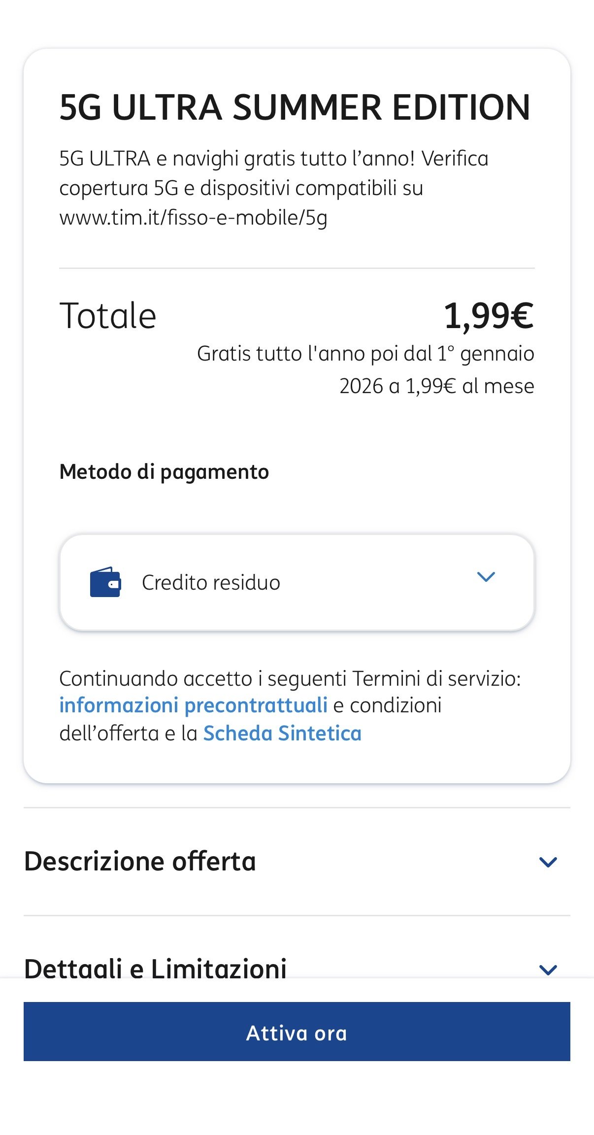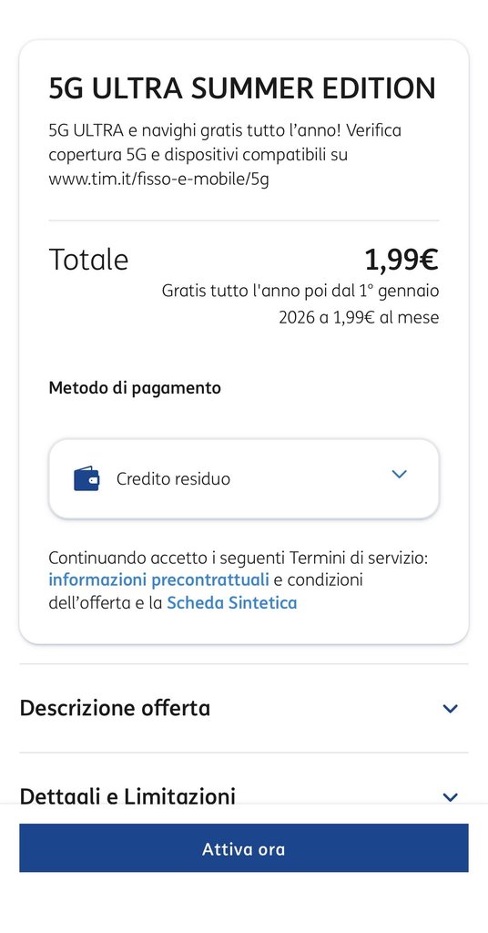 b1ue _Lex_ Arrivata pure l’SMS di conferma: Con 5G ULTRA SUMMER EDITION navighi alla massima velocita' fino a 2Gbps. Con la priorita' di accesso alla rete mobile di TIM puoi condividere video e foto piu' velocemente. Il costo di attivazione è pari a 1,99E. l'offerta e' gratuita fino al 31 dicembre 2025, poi l'offerta si rinnova automaticamente a 1,99E b1ue