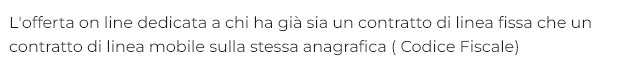 Andando avanti chiede i dati anagrafici... cosa succede se la SIM viene attivata da un cliente che non ha già il fisso? Non si attiverebbero i giga illimitati? Nei dettagli offerta però sembra non ci sia un'indicazione ben precisa, su questo. C'è scritto semplicemente: "L'offerta on line dedicata a chi ha già sia un contratto di linea fissa che un contratto di linea mobile sulla stessa anagrafica ( Codice Fiscale)"... però ho provato a mettere i dati di un'anagrafica che non ha il fisso intestato e sembra procedere comunque 😲 pensavo invece che facesse direttamente lì una verifica, dando poi errore se non corrispondeva ad un'utenza già abbinata.