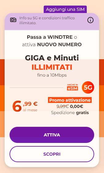 L'offerta è a 6,99€/mese su ricarica automatica o 7,99€/mese su credito residuo, fa scegliere se attivare un nuovo numero o passare da altro gestore.