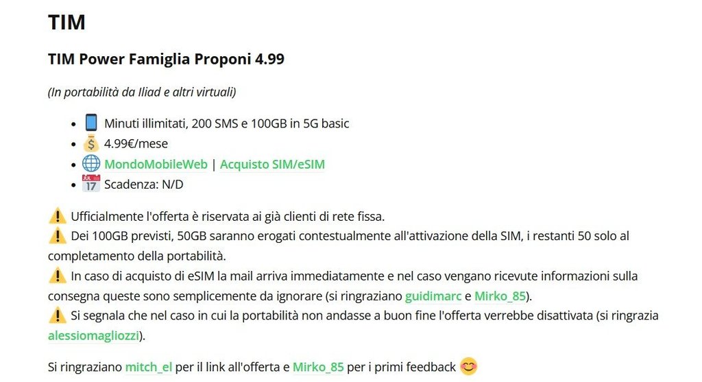 ebbene, è già la seconda telefonata in alcuni mesi che ricevo da parte di Tim, dove viene proposta l'offerta per casa in fibra con annessi e connessi in quanto cliente mobile. Ho già il servizio attivo in fibra, ma intestato ad altra anagrafica, ovviamente diniego l'offerta dell'omino TIM.