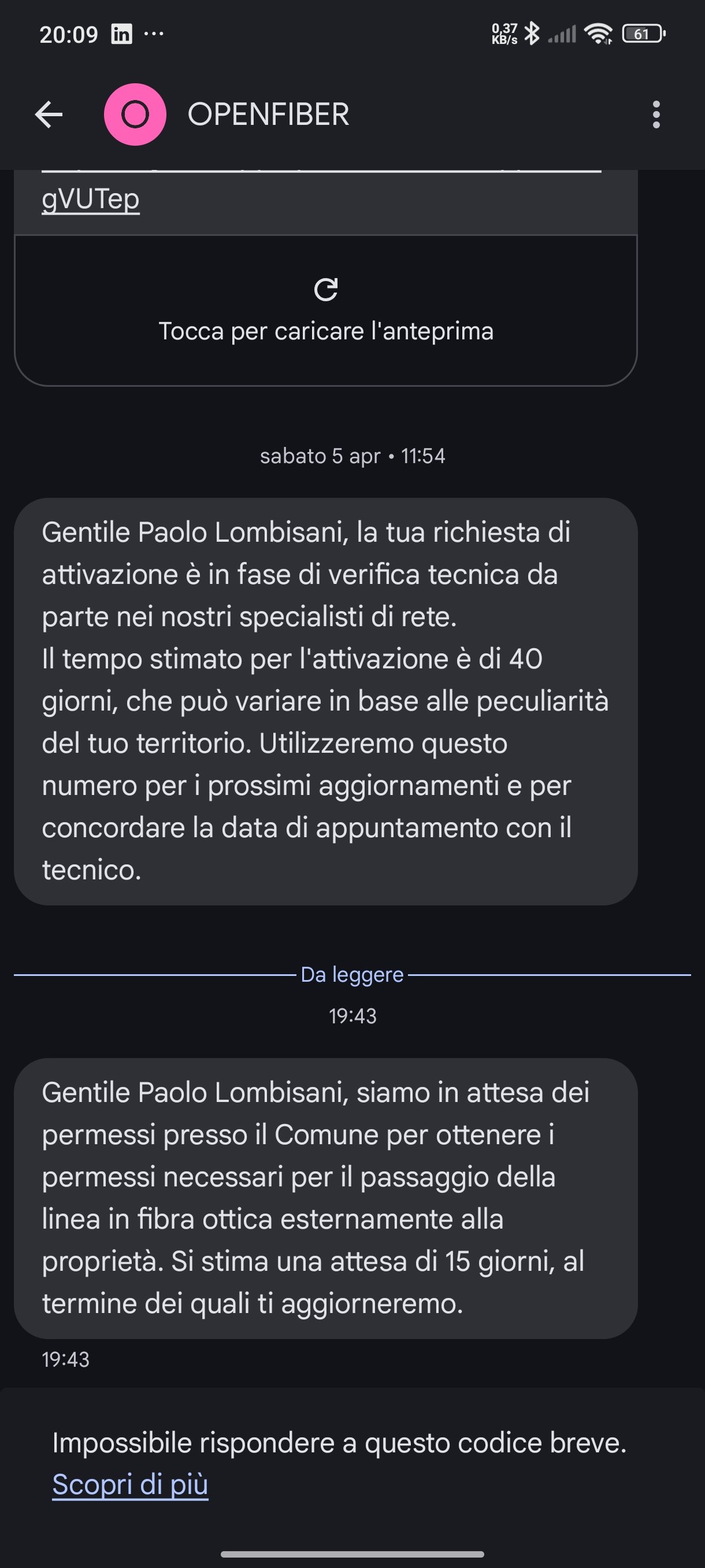 A questo punto mi manca solo la consegna del router da Tiscali, ma lato Open Fiber direi che è andato tutto bene.