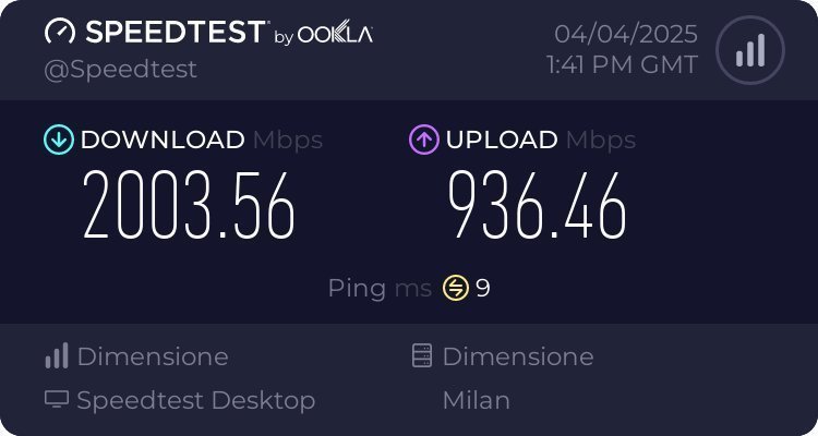 JLDon Buona sera ragazzi, entro anche io nella discussione però in merito all’offerta fibra misto radio di Dimensione. Dunque qualcuno che possa dirmi come si comporta il router e la loro connessione in generale? Io sono vicinissimo al ponte radio e infatti in casa ho una 5G con ALPSIM sotto Wind, che dovrei sfruttare appieno con un’antenna esterna Kiaser… già mi dà 300/400mbps in download e poco più di 12/40mbps in upload, vorrei risolvere lato streaming e gaming / uso lavorativo avvicinandomi ad 1 GB simmetrico tramite Bonding di rete. Utilizzo un MC801A e sto valutando di acquistare un Asus ROG GT B 19000 per dargli le connessioni in WAN da gestire. Grazie attendo le vostre risposte