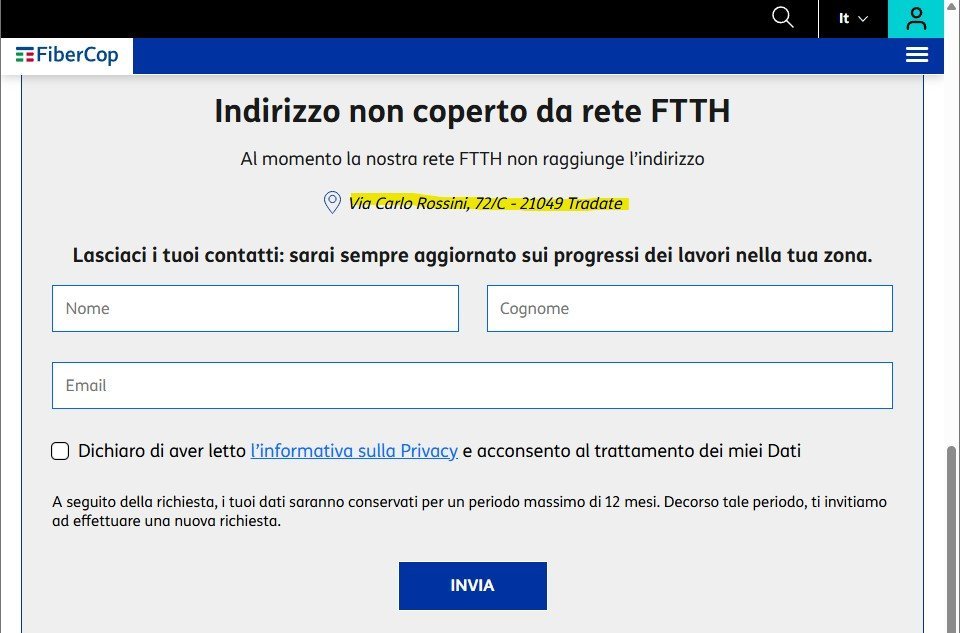 Buongiorno a tutti. Dopo aver letto numerosi post chiedo aiuto a voi del forum. Nel mese di giugno 2024 la zona in cui risiedo è stata oggetto di un importante intervento di posa fibra. Nel locale tecnico del condominio in cui risiedo è stato installato un PTE Fibercop. Ad oggi 13/03/2025, verificando la copertura sul sito Fibercop, il mio indirizzo risulta ancora NON coperto e quindi non commercializzabile. La cosa curiosa è che nello stesso periodo è stato installato un PTE nel condominio di mia suocera, dall'altra parte della strada e il suo indirizzo è risultato raggiungibile già nei mesi successivi e diversi contratti sono già stati attivati. Si tratta solo di aspettare ancora oppure dipende da un problema tecnico o di censimento? Allego la foto dell'installazione situata in via Carlo Rossini 72/C - TRADATE