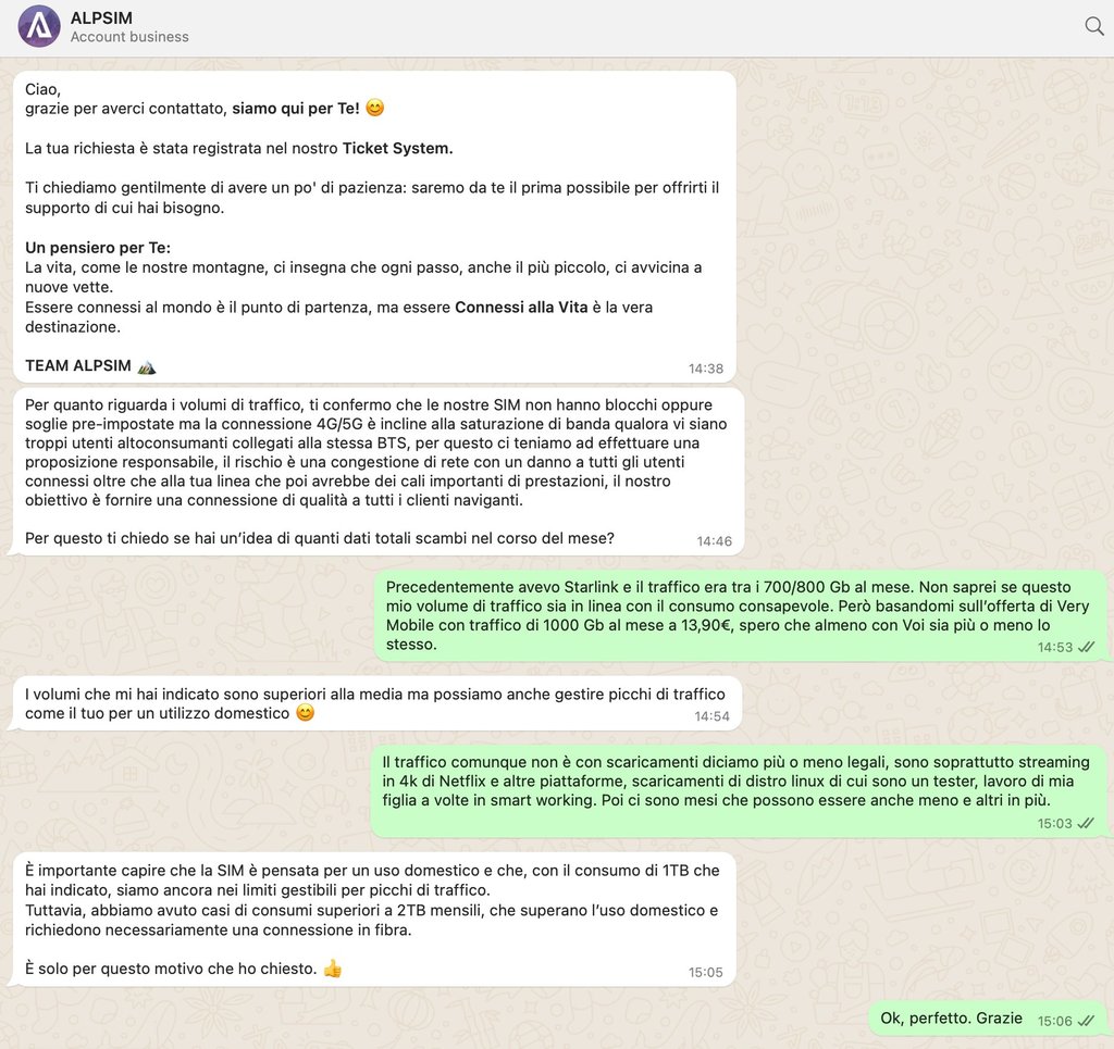 nis66 Io ho Alpsim, e la risposta è stata questa. Io comunque dovrei essere sui 600/800 Gb mese, pertanto non mi preoccupo più di tanto.