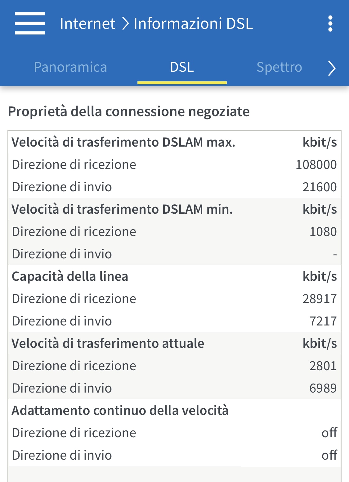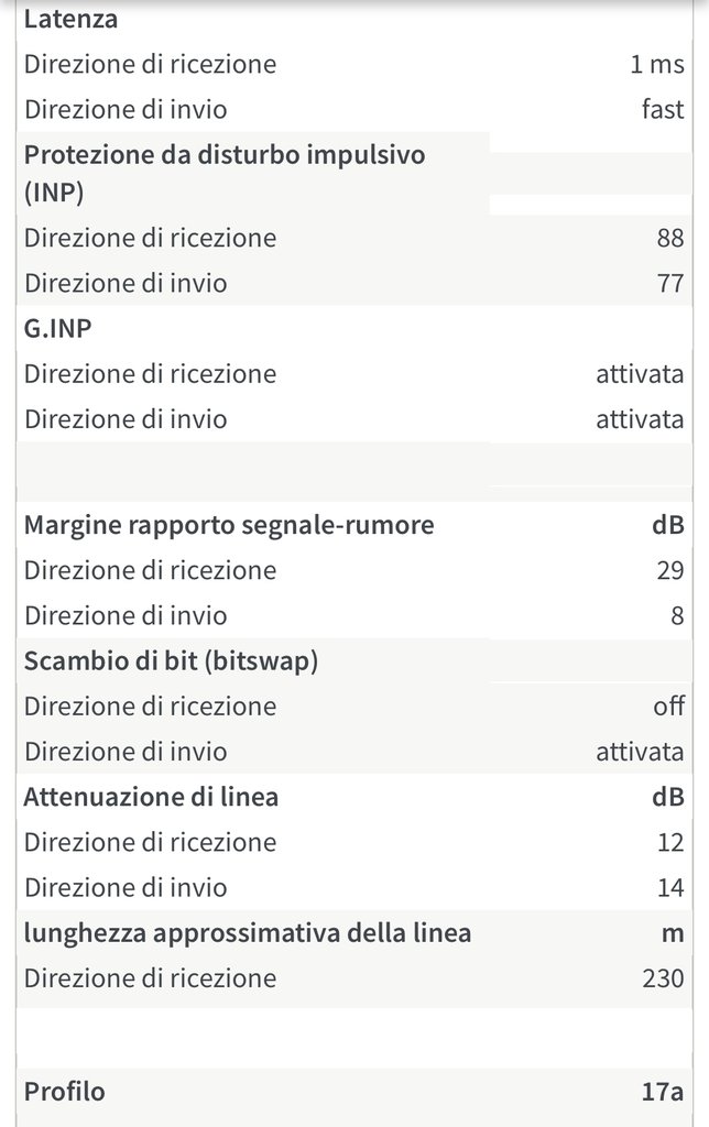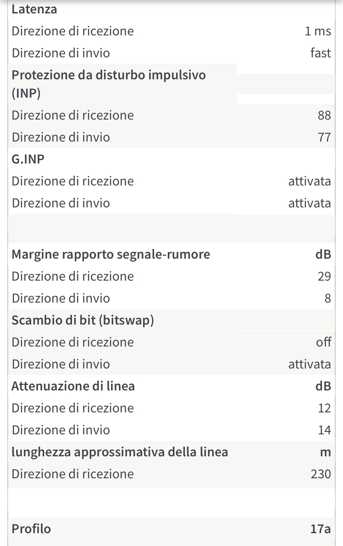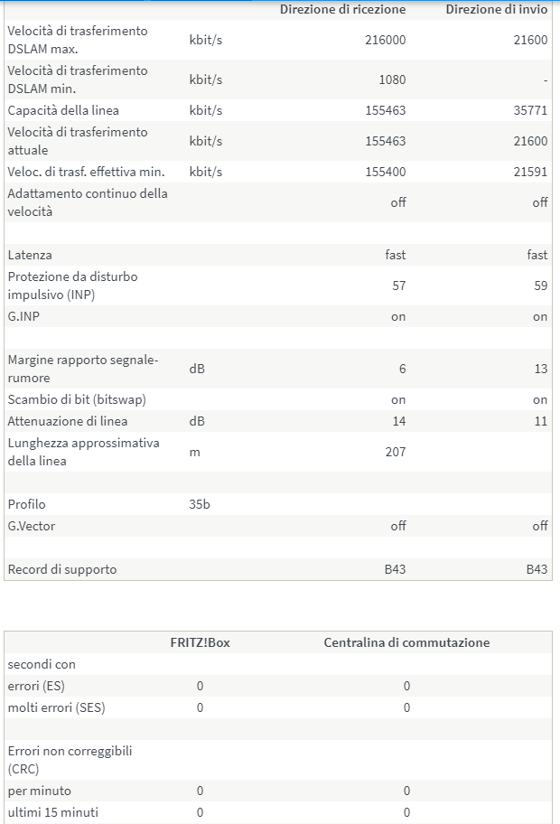 Dopo 20 solleciti, questa mattina è intervenuta una squadra TIM e hanno controllato la tratta. Da quanto m'hanno riferito, hanno cambiato un blocchetto della chiostrina che a parer loro era ossidato, m'hanno cambiato di coppia e hanno anche risolto il problema del basso isolamento (m'hanno riferito che la coppia a cui sono stato attestato ha dei valori buoni). In casa m'hanno sostituito la presa RJ11 della Bticino con una della TIM. Non vorrei essere troppo positivo ma credo che finalmente m'hanno risolto i problemi. Nel pomeriggio ho chiamato il 187 per farmi riattivare il profilo 35b ed ecco i valori di linea: