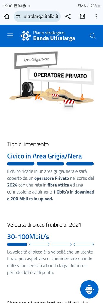 Buonasera a tutti, ho fatto delle verifiche per vedere l'andamento dei lavori per la fibra nella mia zona. La cosa buffa è che praticamente per la mia abitazione mi esce "operatore privato" mentre invece per l'abitazione dei genitori della mia ragazza mi esce "operatore pubblico" (l'abitazione sta a circa 200/250mt di distanza da me). Se faccio la prova tramite il sito di qualunque operatore, casa sua risulterebbe addirittura gia abilitata per la fibra ftth.