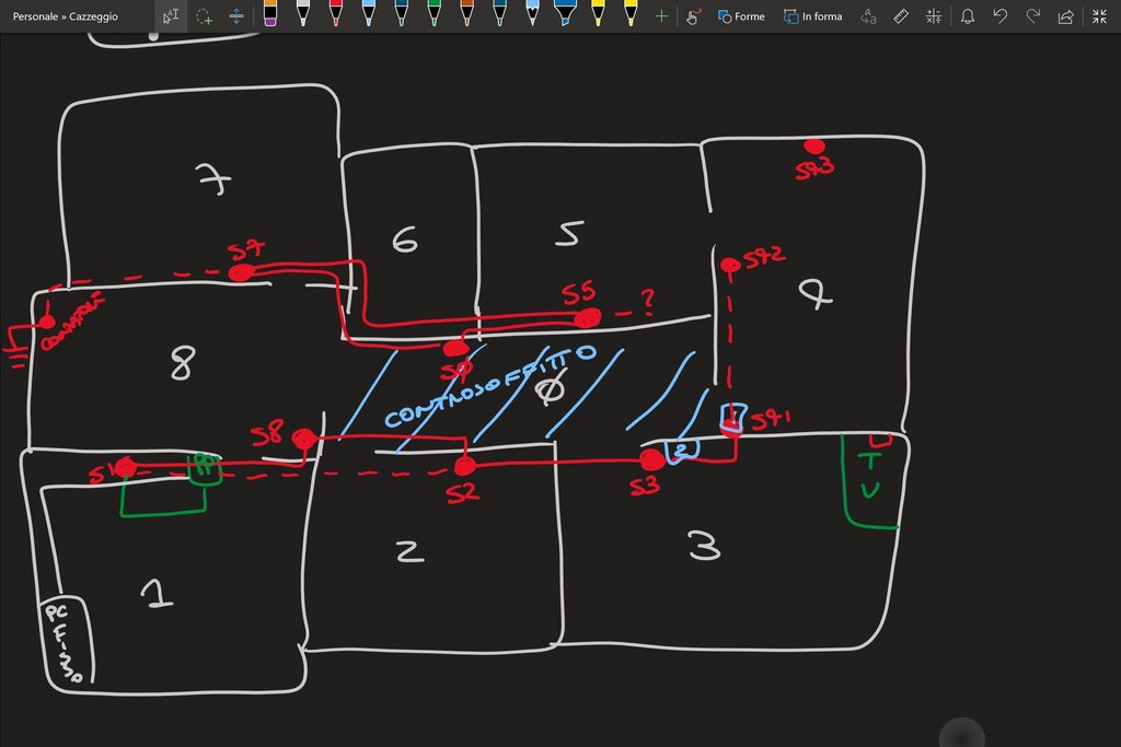Potrei valutare se riesco AP nel controsoffitto o stanza3/4 per la parte destra della casa e router hAP ac2 che fa anche da AP per la parte sinistra nella stanza 1 dove ora c'è il modem (PP verde nel disegno)