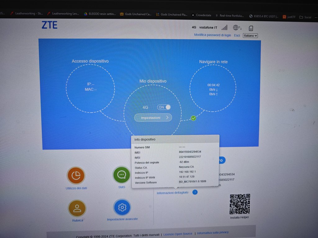 Buongiorno ragazzi vorrei chiedere il parere anche a voi , ho acquistato su subito un zte 7010 , teoricamente senza brand o almeno così mi ha detto il venditore (c'è modo di verificare?) . Ho una SIM Unlimited Vodafone quella 5g da 30 euro al mese per intenderci . Ho collegato il router esterno ad un poe zyxel poweriniector e direttamente al mio PC . Ora quando vado sul sito mi ritrovo dopo aver modificato l'apn con questa situazione. Cioè segnale massimo vedo