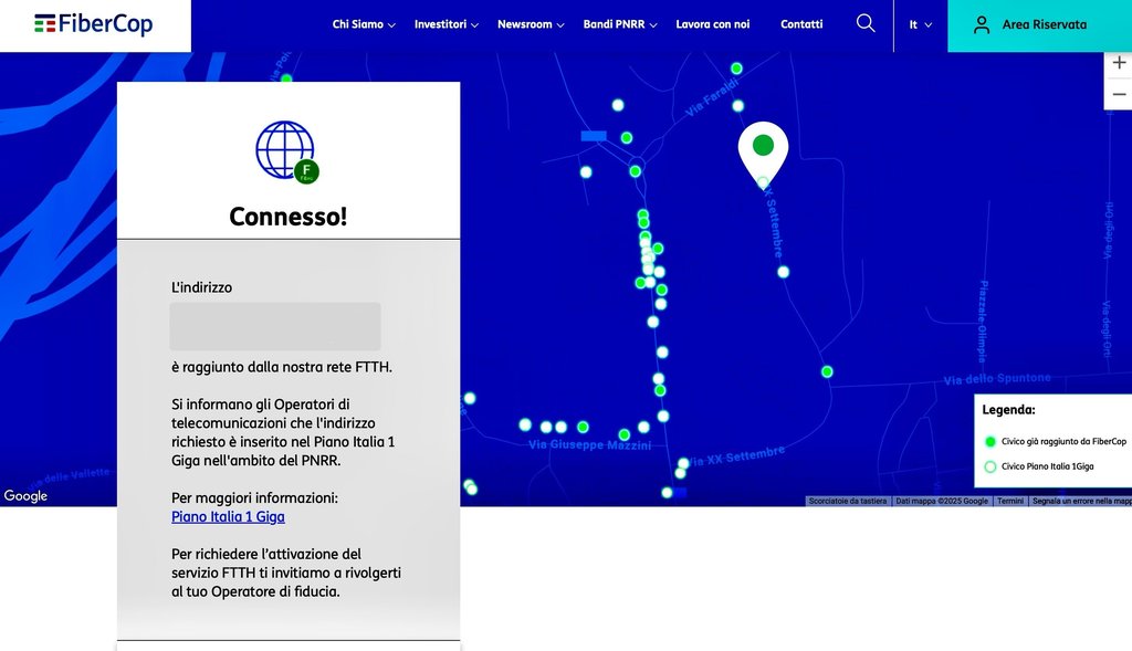 Buonasera, volevo chiedere un'informazione: ma i siti di "verifica copertura" tipo fibercop ecc. sono affidabili? Questa è la situazione al mio indirizzo, coperto da Fibercop nell'ambito del piano Italia 1G: