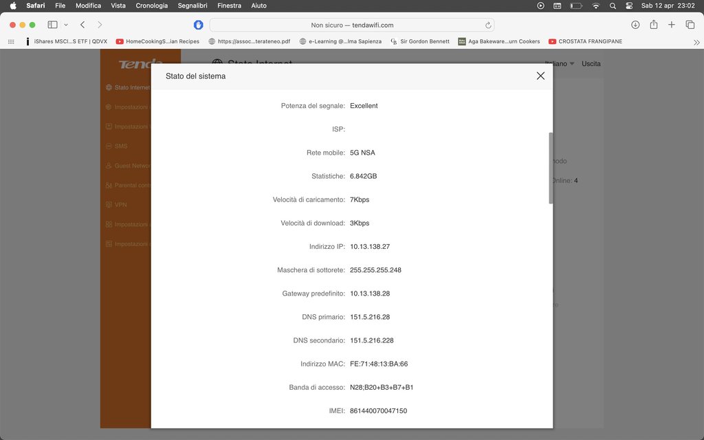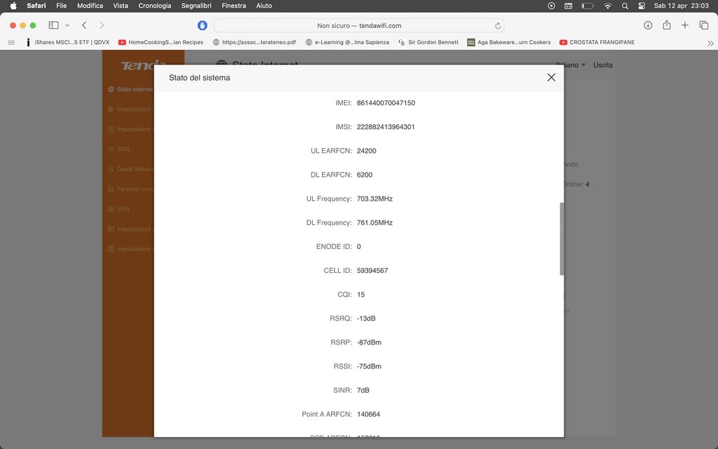 Oggi ho salutato i miei verso le 18 per tornare a casa mia e nel frattempo ho cominciato a monitorare il router tramite l'applicazione Tenda Wifi. Ebbene il router sta navigando in 4G (confermato da mia madre il fatto che la luce arancione lampeggi) e nonostante io abbia fatto più di un riavvio, la situazione non è cambiata. Noto inoltre che il router non aggrega più la banda N28. La connessione funziona comunque e anche 20 minuti fa ho ricevuto una videochiamata su FaceTime senza alcun problema.