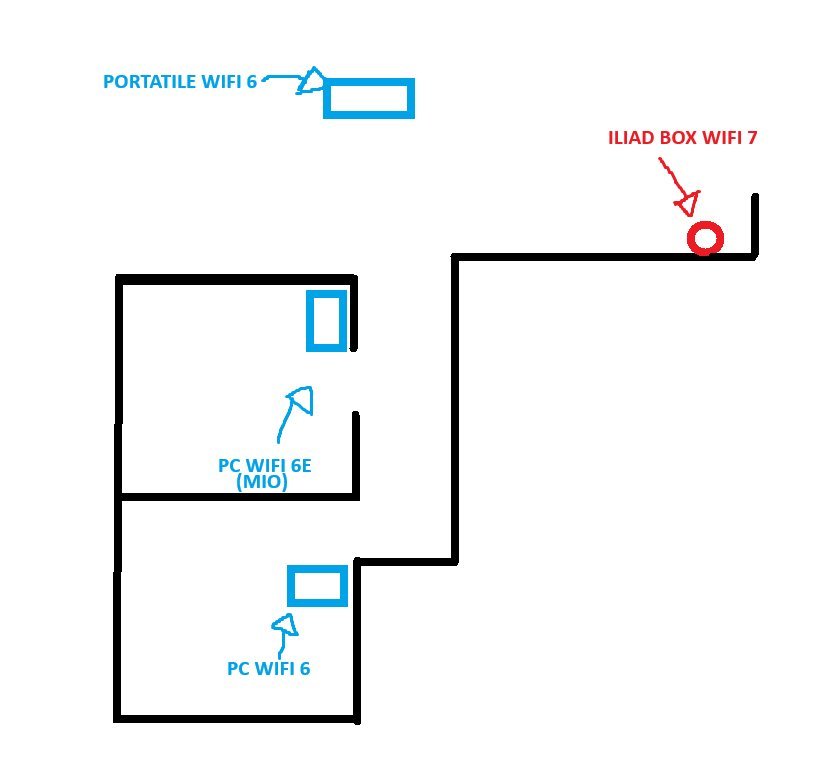 AndreaCicca ti faccio un attimo il quadro della situazione: in casa abbiamo la IB all'ingresso, in linea d'aria tra me e l'IB ci sono 2 muri non troppo spessi. A usare maggiormente la connessione WIFI siamo io e i miei fratelli (tutti con pc, usati per gaming). Volendo, si potrebbe cablare il tutto via ethernet passando dai muri (non so nemmeno come fare, nè i costi), oppure prendere un router più prestante, che assicuri maggiore velocità pura in wifi, di seguito uno schema