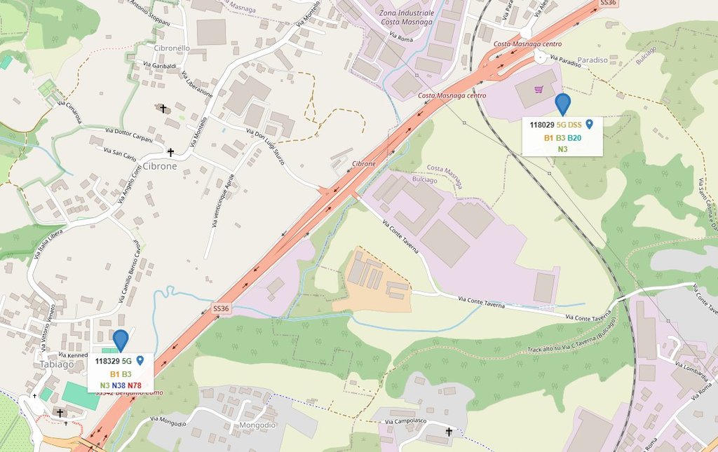 Partendo dal fatto che le opzioni FWA non mi entusiasmano per il fatto di montare antenne esterne ho addocchiato la possibilità di utilizzare Alpsim con un Modem/Router 5G indoor. A livello di copertura dovrei essere a posto in quanto ho una BTS wind/tre a 650 metri linea d'aria con bande B1,B3,N78,N38,N3 e un altra a 800 metri (lascio immagine allegata) e qui arrivano le prime domande