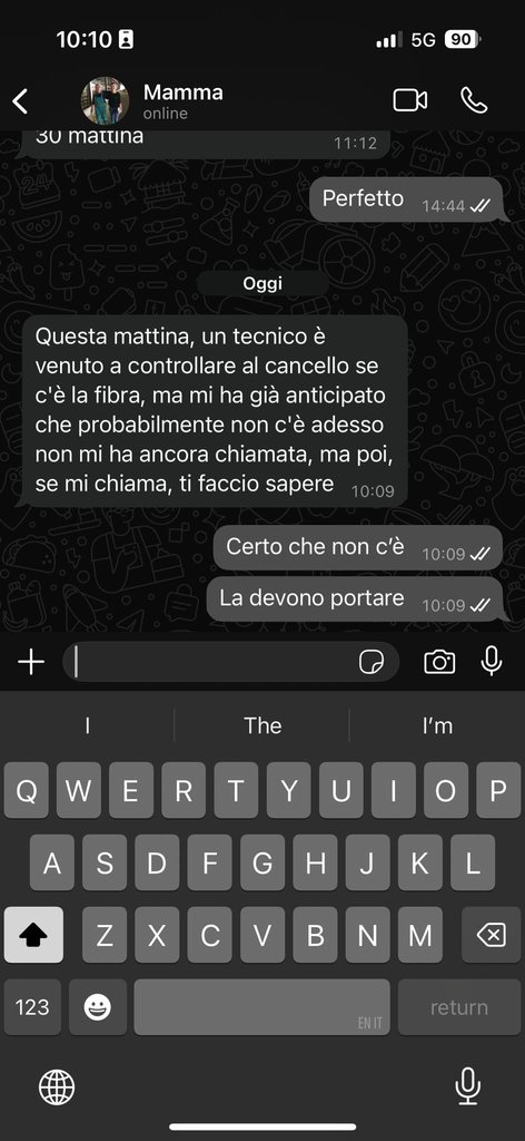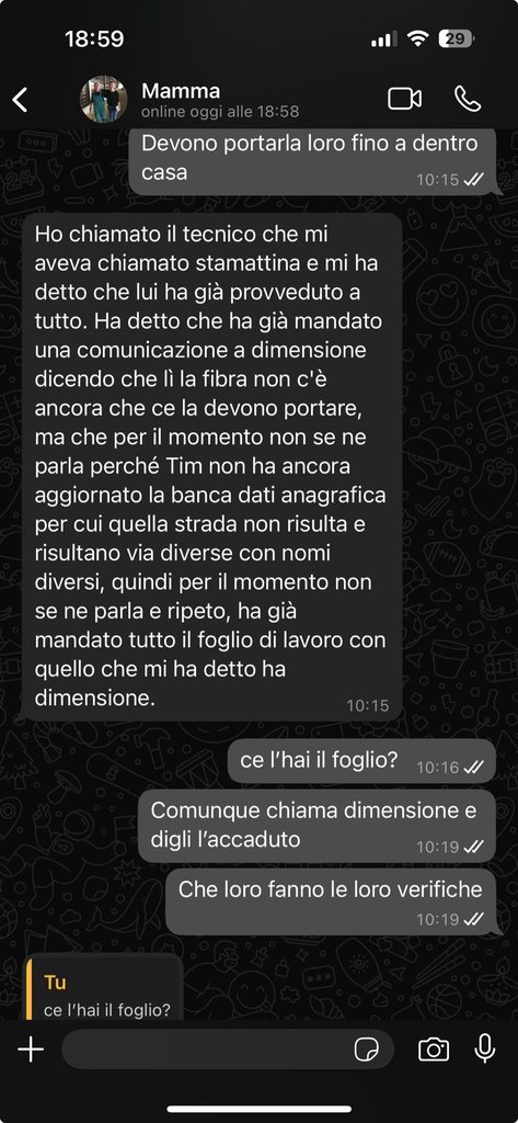 Oggi mia madre è stata contattata telefonicamente che ha chiesto di poter andare a verificare la presenza della fibra al cancello che delimita la proprietà privata, riscontrando appunto la mancanza della stessa (cosa che mi sembra ovvia considerato che si tratta della prima attivazione) e indicando impossibilità a procedere in una chiamata successiva giustificando un presunto errore di anagrafiche e indirizzi sui siti e che dovremmo riprovare molto dopo la fine dell'estate (???). Vi riporto per completezza le conversazioni di mia madre che vi prego di interpretare al meglio non essendo un'appassionata della materia e tantomeno un'addetta ai lavori (e detta i messaggi a siri 😅)