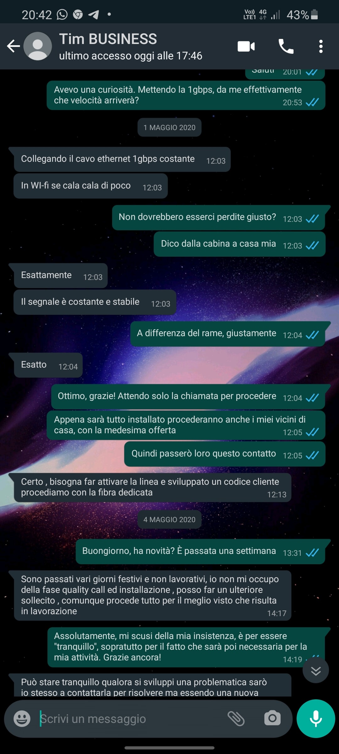 [cancellato] Herian [18/5, 13:48] [rimosso per privacy]: Ho fissato per domani l'installazione, in concomitanza è possibile programmare anche il tecnico per la fibra dedicata? [19/5, 09:35] Tim BUSINESS: Lei quando ha disponibilità ? [19/5, 09:35] Tim BUSINESS: In modo che fisso un appuntamento appena disponibile [20/5, 11:39] Tim BUSINESS: Nella prima settimana di giugno , riceverà direttamente una chiamata per fissare data ed ora precisa