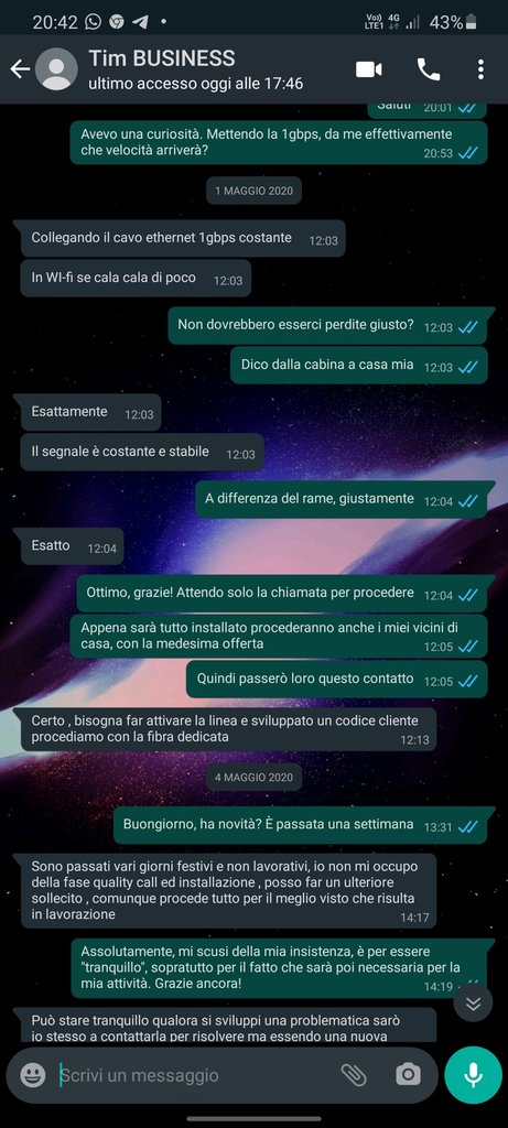 [cancellato] Aggiornamenti: Mi ha appena chiamato una responsabile TIM. Domani mi verrà attivata la linea BUSINESS e la settimana successiva ci sarà il passaggio alla fibra ottica dedicata direttamente tramite TIM, mi sono stupito, ormai avevo perso completamente le speranze. Mi ha detto che l'armadio era saturo e che ora si può effettuare il passaggio alla fibra DEDICATA, oggi pomeriggio verranno inviate le condizioni contrattuali quindi presumo vi che vi saranno anche tutte queste cose.
