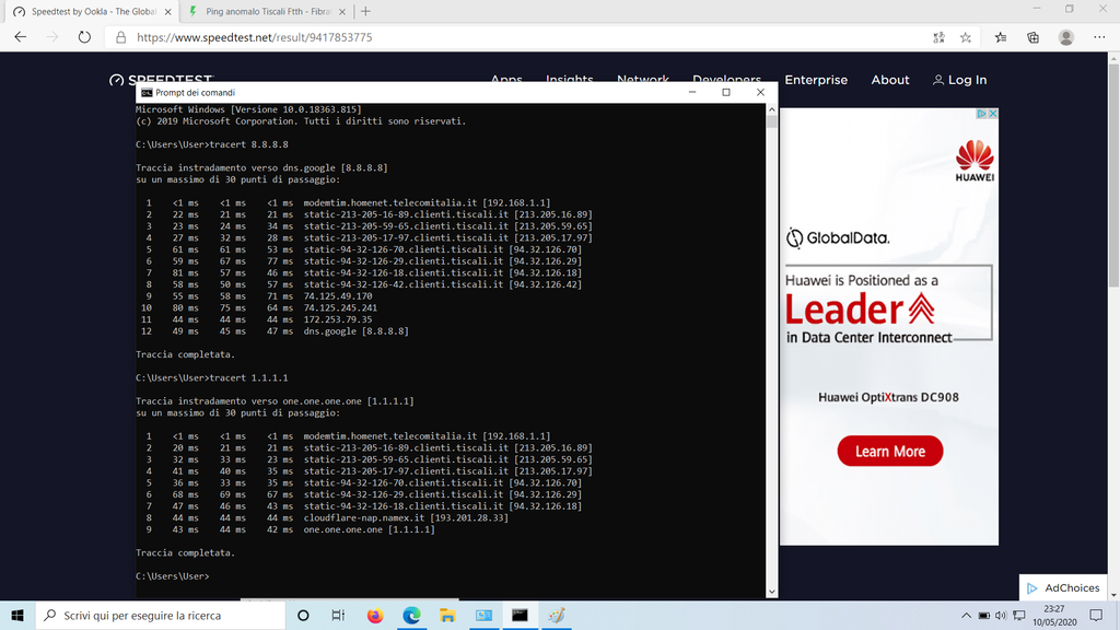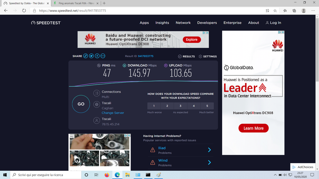 Buonasera, non ho potuto fare a meno di leggere questa discussione e direi che mi trovo nella stessa situazione. Sono un cliente tiscali FTTH di Reggio calabria, linea attivata a marzo 2019. Da quando ho attivato pingo da speedtest sul server Tiscali di cagliari 18ms quando va bene (in media sto sempre sopra i 25ms) e 60ms la sera quando va male. Puroppo da videogiocatore mi sto trovando malissimo. Ci aggiungo che nell'ultimo mese e mezzo datata la situazione di congestione la mia velocità in download spesso cala anche sotto i 20mbps e non supera mai i 250 mbps. Ho aperto tantissimi ticket e mai hanno risolto il problema ping invece come velocità riuscivo a fare in passato anche 550mbps. Vorrei capire se qualcuno può aiutarmi o dirmi come risolvere il problema ping.