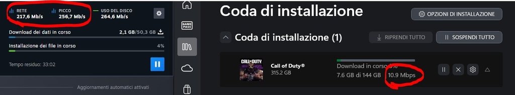 Unico problema di cui mi sono accorto adesso é che dal pc dove gioco, a seconda dei programmi é come se ci fosse un blocco sulla velocità dei download, esempio: su un determinato programma scarico