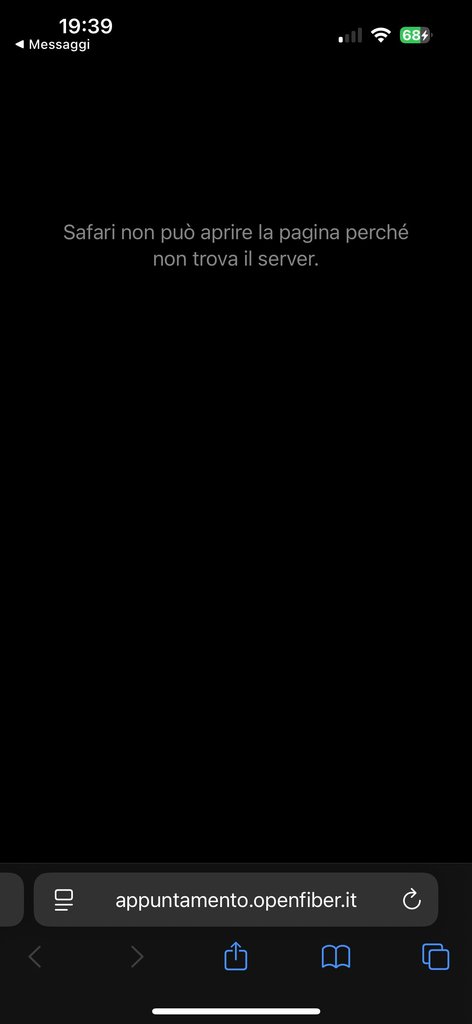 Gentile cliente , La contattiamo per l'attivazione della connessione in fibra ottica FTTH che ha richiesto a DIMENSIONE. Per completare l'attivazione La invitiamo a prendere un appuntamento con il tecnico di Open Fiber cliccando a questo link … e seguendo le istruzioni.